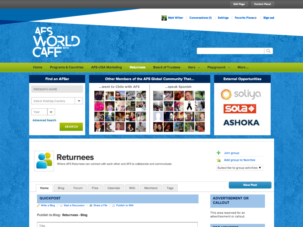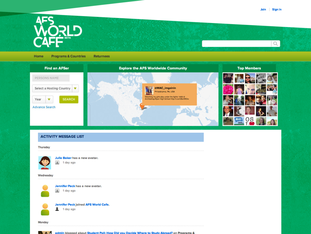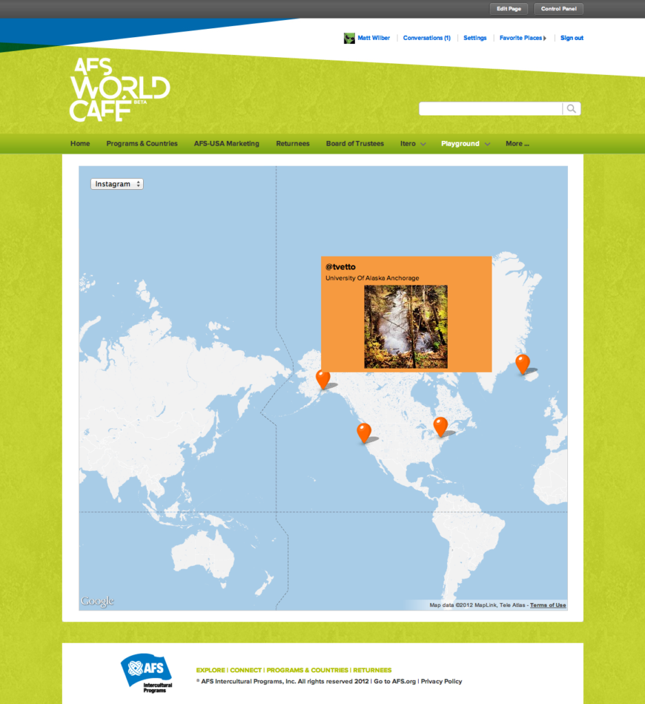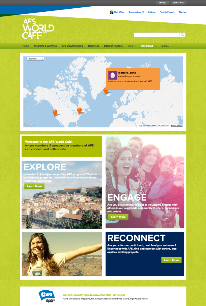 Web Based Community for AFS students. Site is built on top of .net based social networking platform Telligent. Features custom theme, google map incorporating twitter and Instagram feeds.