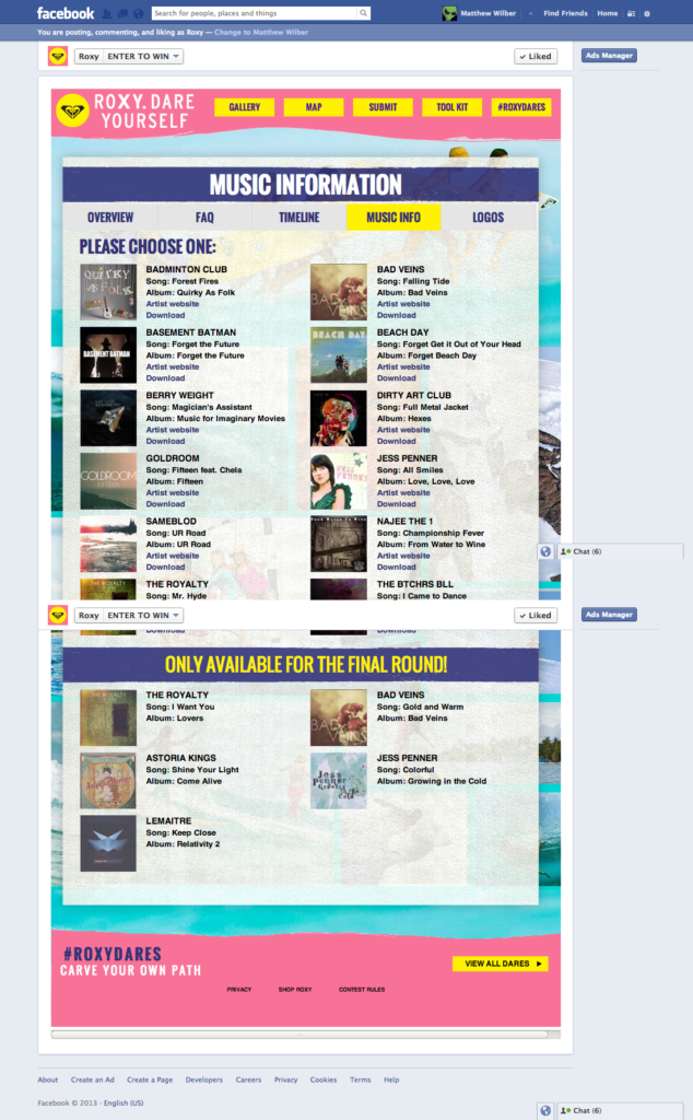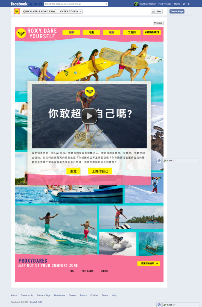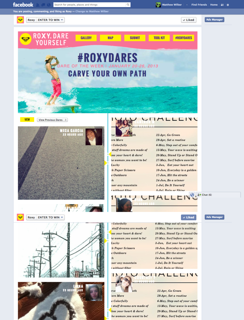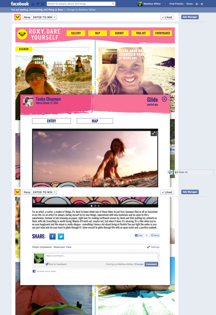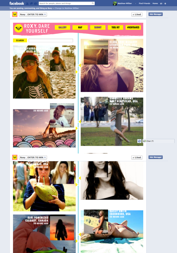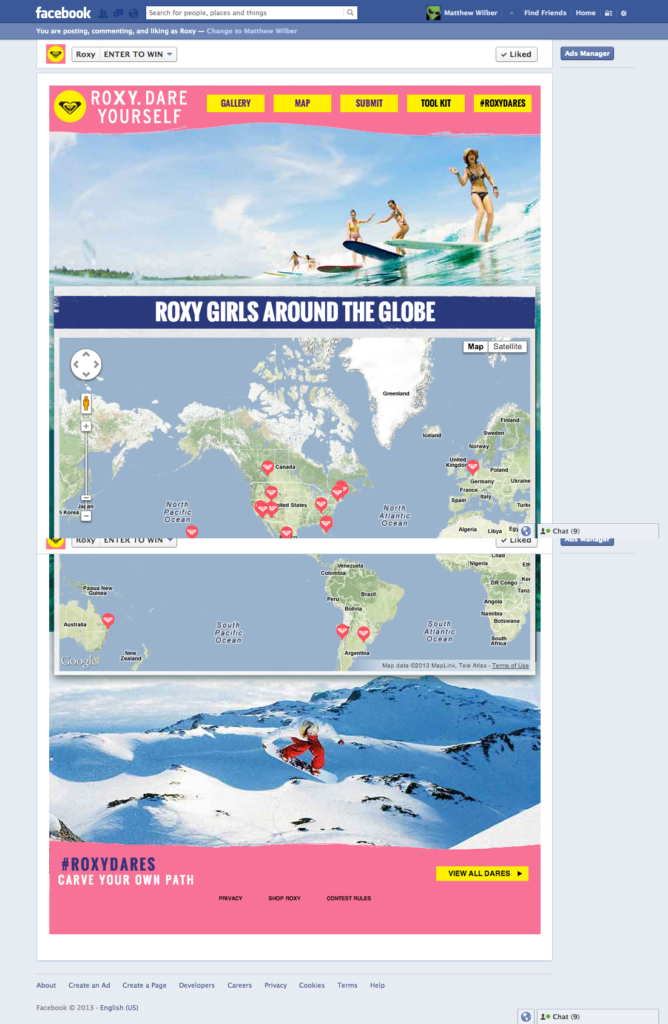 Custom facebook app created for the ROXY%2C Dare Yourself photo/video contest. Released in 12 languages and featured on over 20 facebook pages and websites worldwide. The app features ajax-driven contest submission with image and video uploads%2C videos are automatically posted to the Roxy YouTube channel. Entries are featured in an interactive gallery which includes integrated search. The app includes a live feed of instagram photos featuring a weekly hashtag challenge. A back-end CMS was custom built as well%2C to allow the Roxy team to moderate entries.