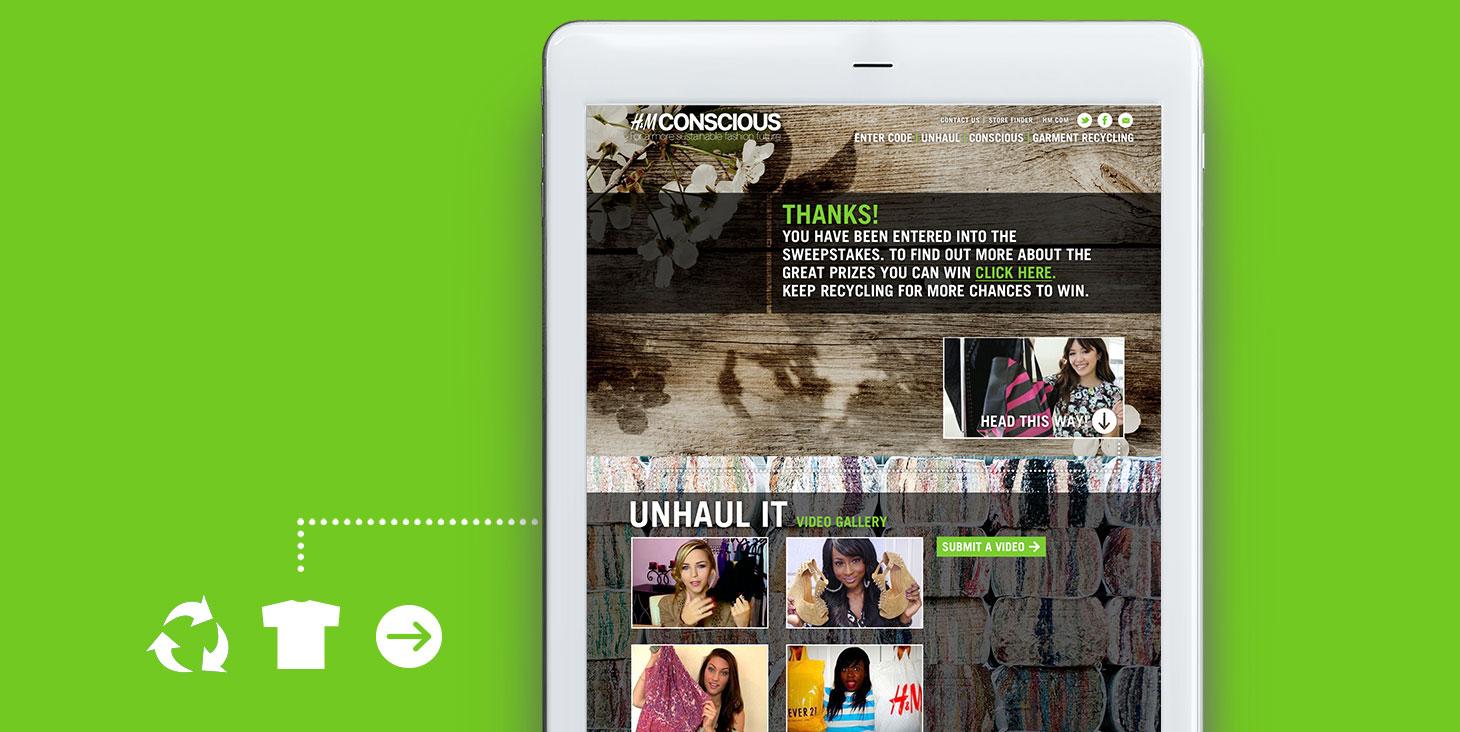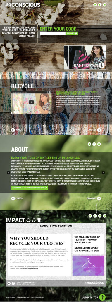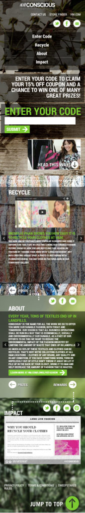 Promotional web site for the H&M Conscious clothing recycling campaign. Features a responsive layout and touch-friendly interface. Shoppers who make clothing donations at H&M locations receive a code which is tied to the site’s contest database. Back-end features include management of coupons emailed to contest applicants and selection of 3 random contest winners. The site also features YouTube and Instagram galleries.