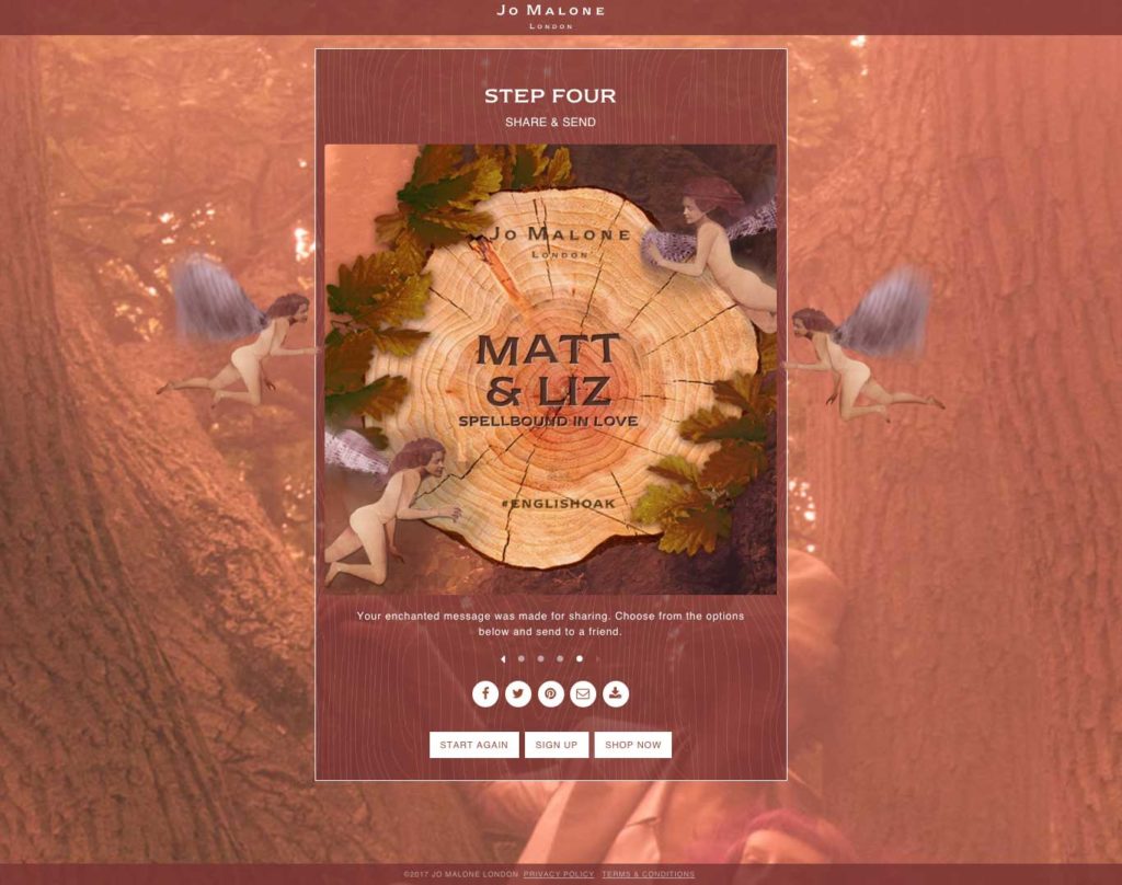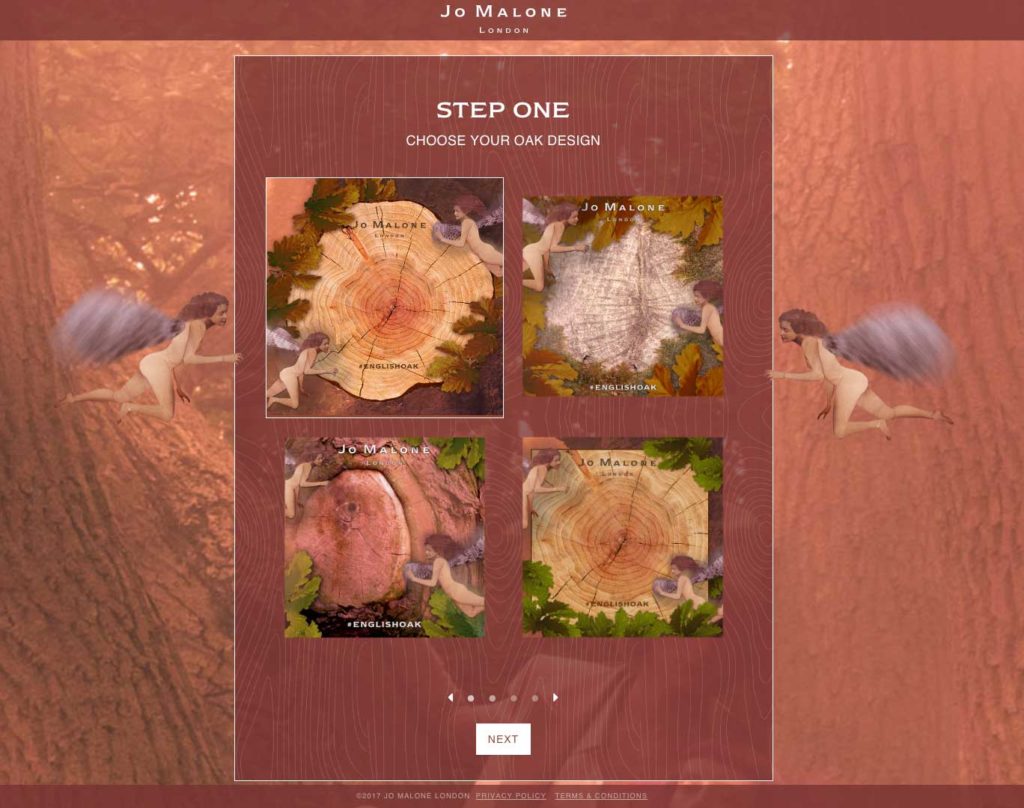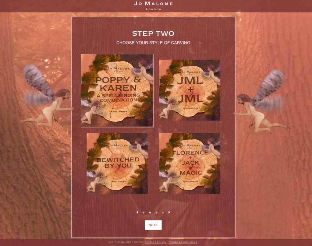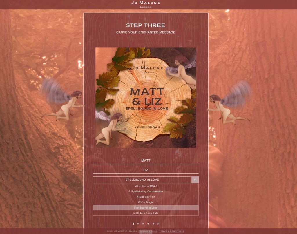 Custom website built for the Jo Malone English Oak product launch. The website features an HTML5 canvas app which allows users to produce an image of an oak tree with a custom carved message. Images can be saved to share on social media or email. The website is translated into 14 different languages and featured in campaigns in over 25 countries.